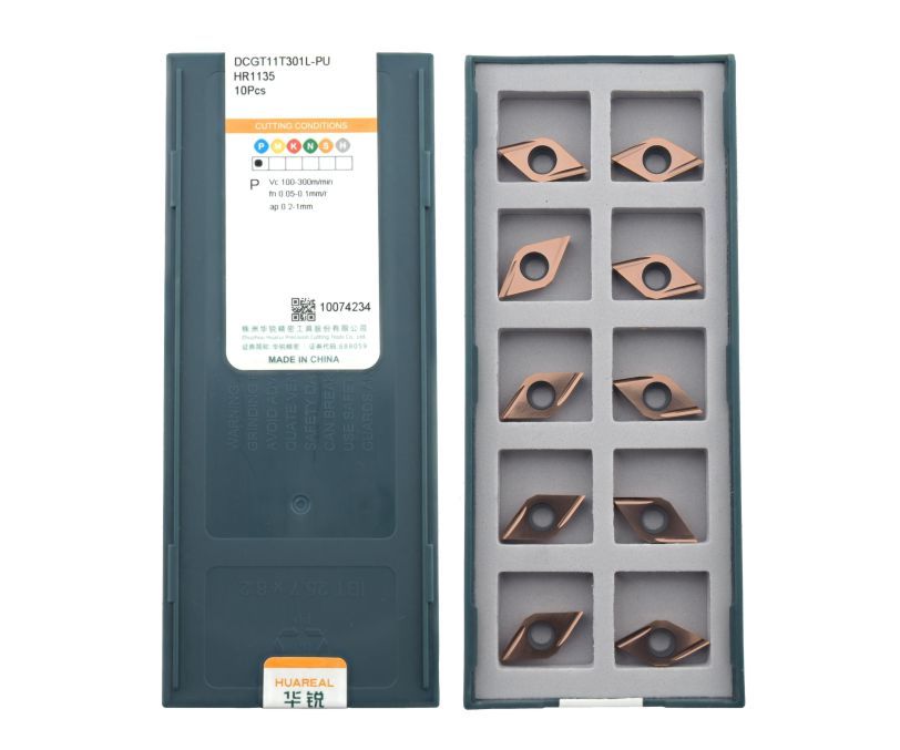 Твердосплавная сменная пластина DCGT11T301L-PU-HR1135 бренда Huareal применяется для чистовой обработки заготовок из стали.
