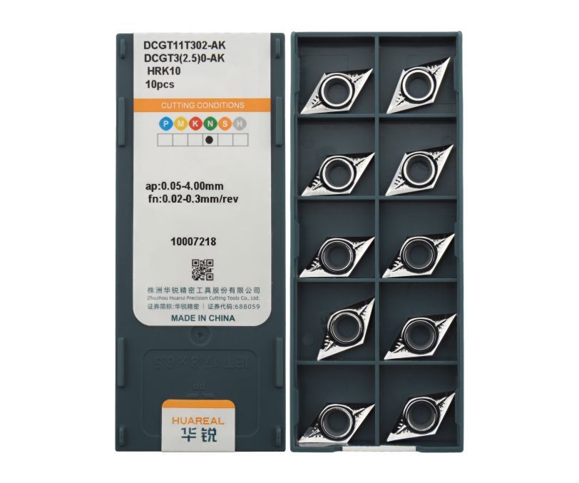 Твердосплавная сменная пластина DCGT11T302-AK-HRK10 бренда Huareal применяется для чистовой обработки заготовок из алюминия и сплавов цветных металлов.