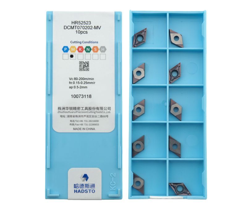 Твердосплавная сменная пластина DCMT070202-MV-HR52523 бренда Huareal применяется для чистовой обработки заготовок из нержавеющей стали.
