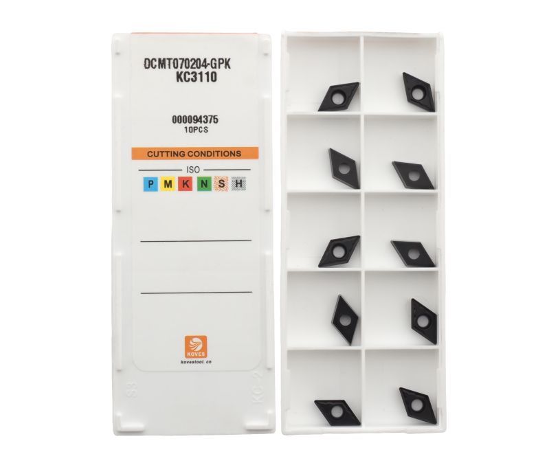 Твердосплавная сменная пластина DCMT070204-GPK-KC3110 бренда Koves применяется для получистовой обработки заготовок из стали и чугуна.