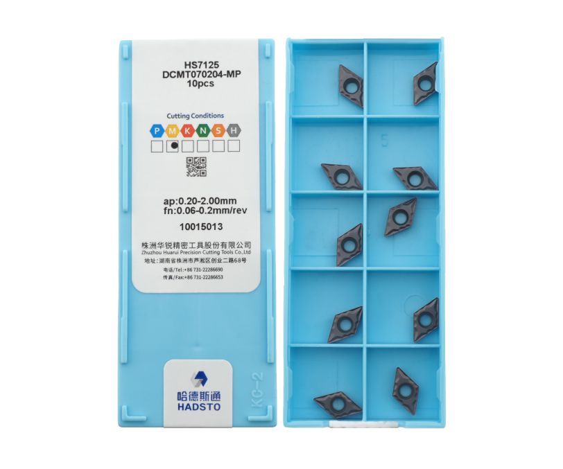 Твердосплавная сменная пластина DCMT070204-MP-HS7125 бренда HADSTO применяется для чистовой обработки заготовок из нержавеющей стали.