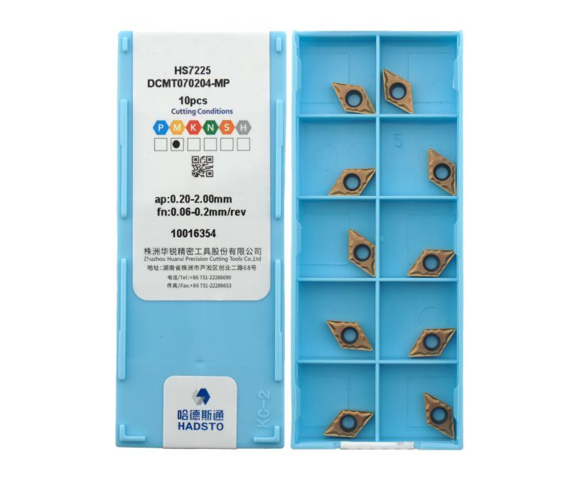 Твердосплавная сменная пластина DCMT070204-MP-HS7225 бренда HADSTO применяется для чистовой обработки заготовок из нержавеющей стали.