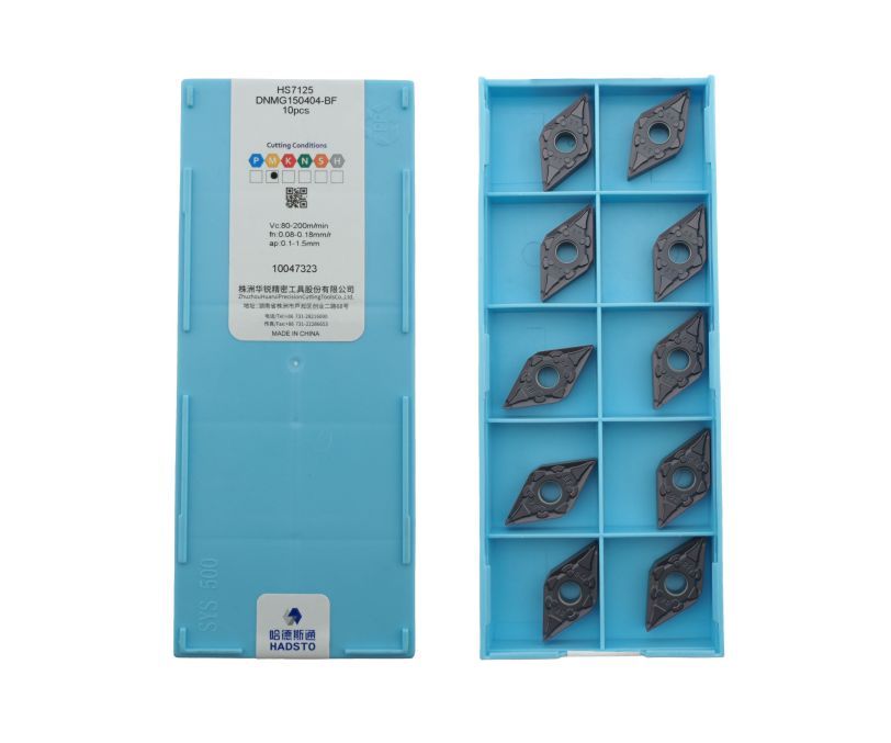 Твердосплавная сменная пластина DNMG150404-BF-HS7125 бренда HADSTO применяется для чистовой обработки заготовок из нержавеющей стали.