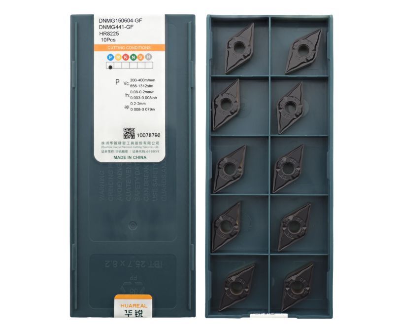 Твердосплавная сменная пластина DNMG150604-GF-HR8225 бренда Huareal применяется для чистовой обработки заготовок из стали.