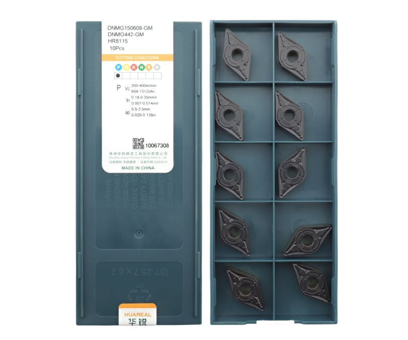 Твердосплавная сменная пластина DNMG150608-GM-HR8115 бренда Huareal применяется для получистовой обработки заготовок из стали.