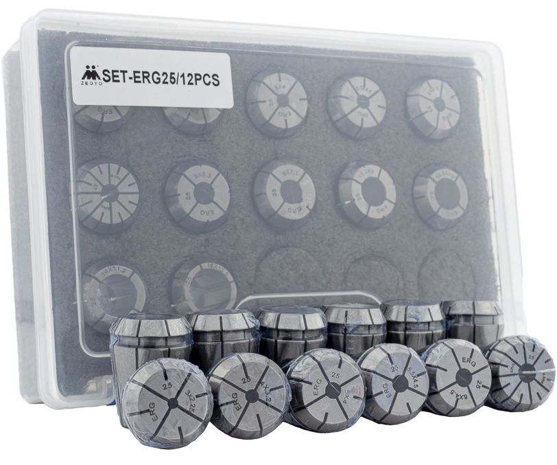 ER25G-SET-12 - набор, состоящий из 12 резьбонарезных цанг ER25G, предназначенных для фиксации инструмента с хвостовиком квадратной формы (от 3x2,25 до 16x12,5 мм).