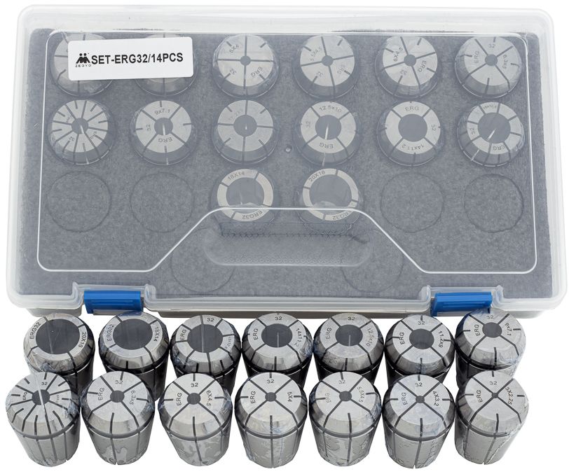 ER32G-SET-14 - набор, состоящий из 14 резьбонарезных цанг ER32G, предназначенных для фиксации инструмента с хвостовиком квадратной формы (от 3x2,25 до 20x16 мм).