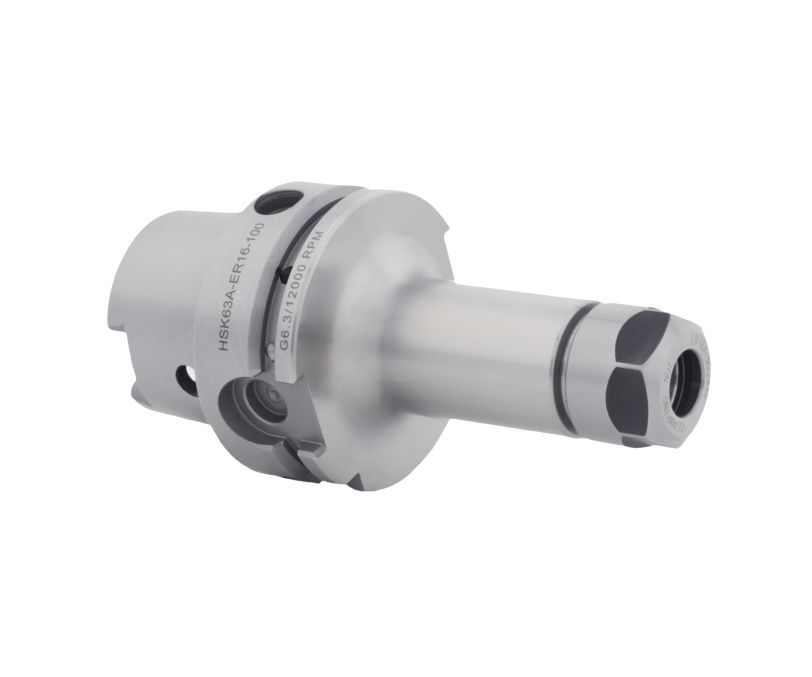 Фрезерный патрон HSK63A-ER16-100 (DIN 69893, ISO 12164/1) применяется для высокоточной обработки при скорости вращения шпинделя не более 25 000 об/мин. Вылет патрона от шпинделя составляет 100 мм. Фиксация режущего инструмента в корпусе патрона осуществляется при помощи зажимной цанги ER16 (DIN 6499) и гайки типа А. В зависимости от размера отверстия цанги в патрон устанавливается осевой режущий инструмент с цилиндрическим хвостовиком диаметром от 1 до 10 мм. Конструкция патрона позволяет производить автоматическую смену инструмента в станках с ЧПУ и обрабатывающих центрах.