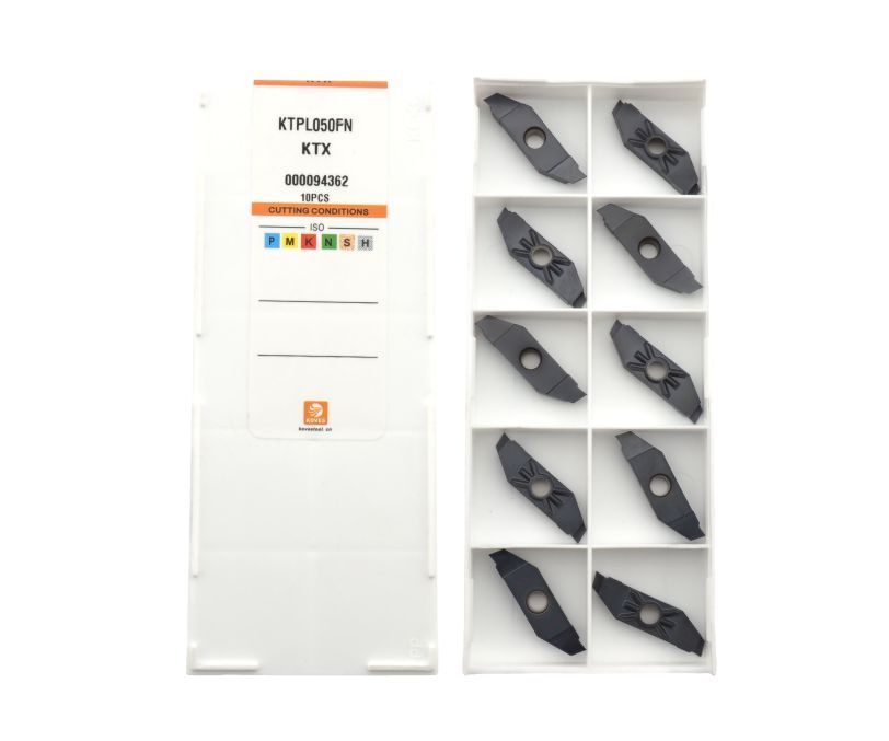 Твердосплавная сменная пластина KTPL050FN-KTX (левое исполнение) используется для обработки канавок. Тип обрабатываемого материала: сталь. Для увеличения износостойкости и срока службы пластины применяется защитное покрытие KTX. Ширина пластины 0.5 мм. Радиус при вершине 0.05 мм.