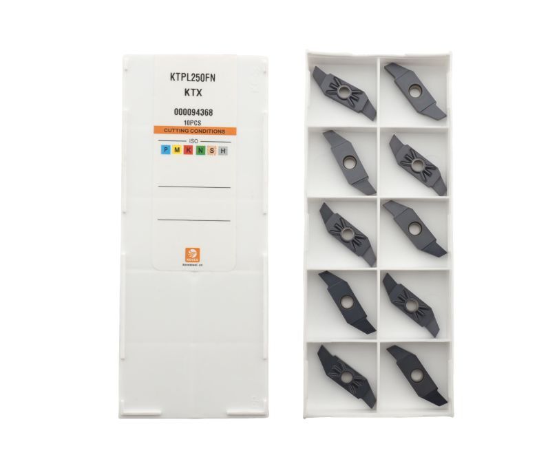Твердосплавная сменная пластина KTPL250FN-KTX (левое исполнение) используется для обработки канавок. Тип обрабатываемого материала: сталь. Для увеличения износостойкости и срока службы пластины применяется защитное покрытие KTX. Ширина пластины 2.5 мм. Радиус при вершине 0.05 мм.