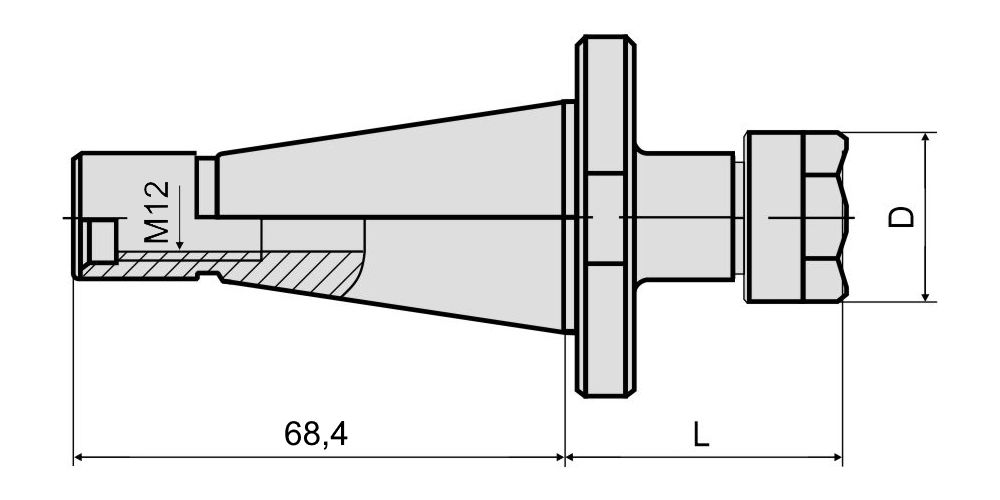 Фрезерный патрон NT30-ER20-060 (DIN 2080, ISO 7388/1) обеспечивает надежную фиксацию осевого режущего инструмента в шпинделе станка. Применяется в универсальных станках фрезерной и сверлильной группы с ручной сменой инструмента. Вылет патрона от шпинделя составляет 60 мм. Фиксация инструмента в корпусе патрона осуществляется при помощи зажимной цанги ER20 (DIN 6499) и гайки типа UM. В зависимости от размера отверстия цанги в патрон устанавливается инструмент с цилиндрическим хвостовиком диаметром от 1 до 13 мм. Крепление оправки в шпинделе производится при помощи штревельного болта M16, который не входит в комплект поставки и приобретается дополнительно. Тип подачи СОЖ: АD (через центральное отверстие).