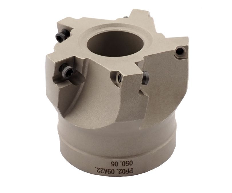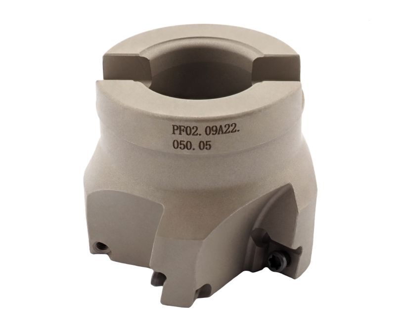 Фреза торцевая насадная с главным углом в плане 90° типа PF02. Рабочий диаметр D 50 мм, посадочный диаметр d 22 мм. Максимальная глубина фрезерования 6,5 мм. Количество зубьев: 5. Применяемые пластины: SEET09T308PER.