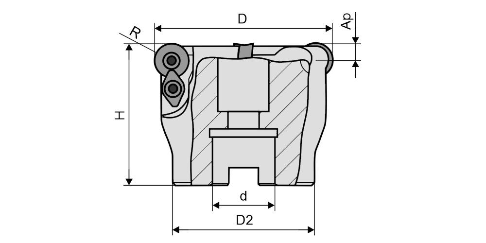 Фреза торцевая насадная для круглых пластин типа RF03. Рабочий диаметр D 50 мм, посадочный диаметр d 22 мм. Максимальная глубина фрезерования 6,0 мм. Количество зубьев: 4.