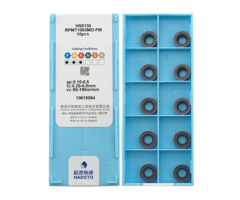 Фрезерная пластина RPMT1003MO-FM-HS5130 бренда HADSTO применяется для обработки заготовок из стали, нержавеющей стали и чугуна.
