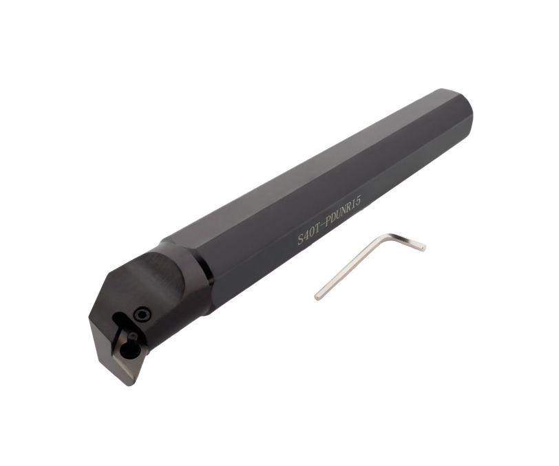 Токарный резец (державка) расточной S40T-PDUNR15 фирмы SANT является идеальным инструментом для внутреннего продольного точения и подрезки торца металлических изделий при помощи сменные твердосплавные пластины типа DN.. 1506... Крепление пластины к державке S40T-PDUNR15 осуществляется прижимом рычагом через отверстие. Державка S40T-PDUNR15 типа S выполнена из стали без канала для подачи СОЖ. Сечение резца составляет 40 мм, минимальный диаметр растачивания 50 мм. Длина державки S40T-PDUNR15 равна 300 мм, исполнение: правое.