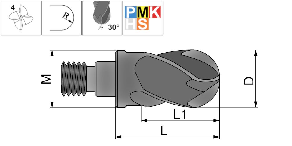Сменные твердосплавные головки. Сферические концевые 4-х зубые головки с режущим центром. С резьбовым соединением M5, радиусом 5 мм, длинна шейки 12,4 мм, длина режущей части 5,5 мм и углом спирали 30°. Используется для обработки материалов твердостью до 45 HRC (сталь, нержавеющая сталь, жаропрочные сплавы). Для увеличения износостойкости и срока службы инструмента используется высокоэффективное защитное покрытие JF530M.