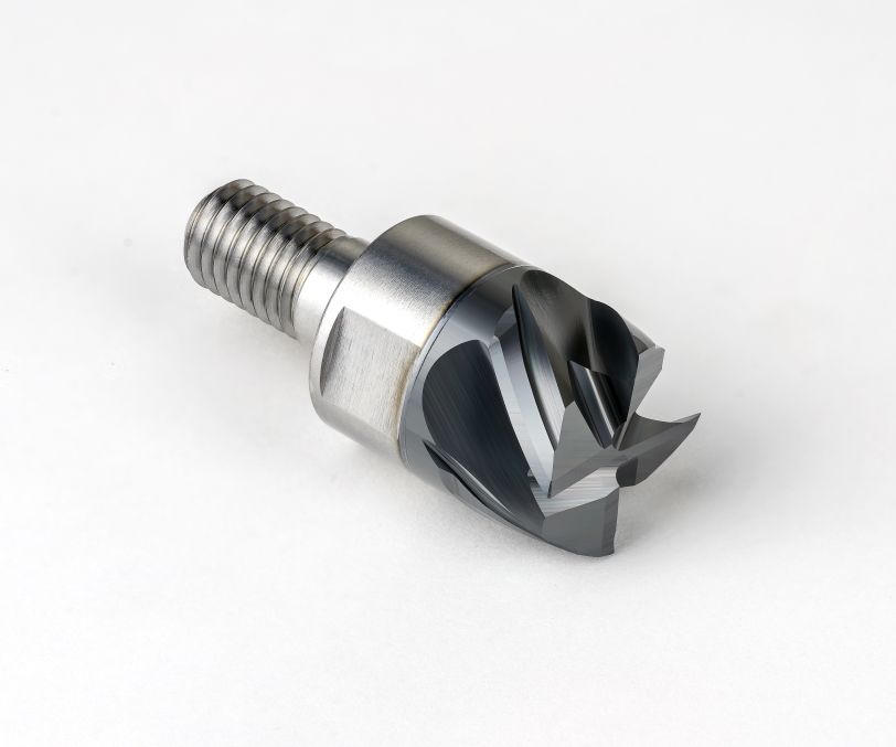 Сменные твердосплавные головки. Концевые цилиндрические 4-х зубые головки с режущим центром. С резьбовым соединением M8, радиусом мм, длинна шейки 18,7 мм, длина режущей части 8,5 мм и углом спирали 40°. Используется для обработки материалов твердостью до 45 HRC (сталь, нержавеющая сталь, жаропрочные сплавы). Для увеличения износостойкости и срока службы инструмента используется высокоэффективное защитное покрытие JF530M.