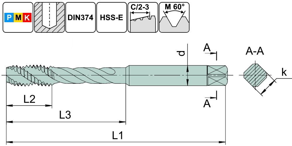 TSF1.M12х1,25.6H.DIN374.TiN.M35 Метчик М12х1,25 для глухих отверстий, DIN374, с покрытием TiN