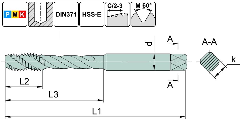 TSF1.M12х1,75.6H.DIN376.TiN.M35 Метчик М12х1,75 для глухих отверстий, DIN376, с покрытием TiN
