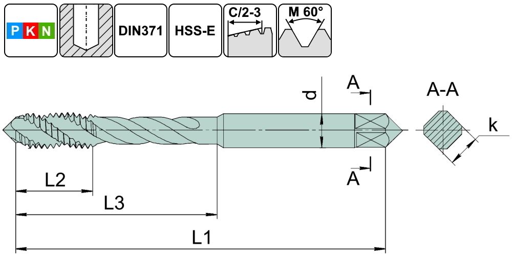 TSF1.M3х0,5.6H.DIN371.TiN.M35 Метчик М3х0,5 для глухих отверстий, DIN371, с покрытием TiN