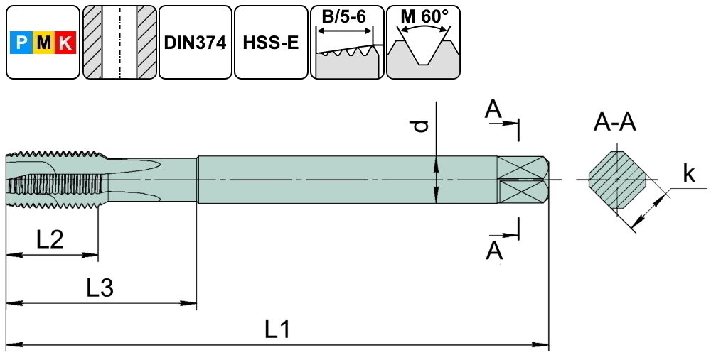 TSP1.M12х1,5.6H.DIN374.TiN.M35 Метчик М12х1,5 для сквозных отверстий, DIN374, с покрытием TiN
