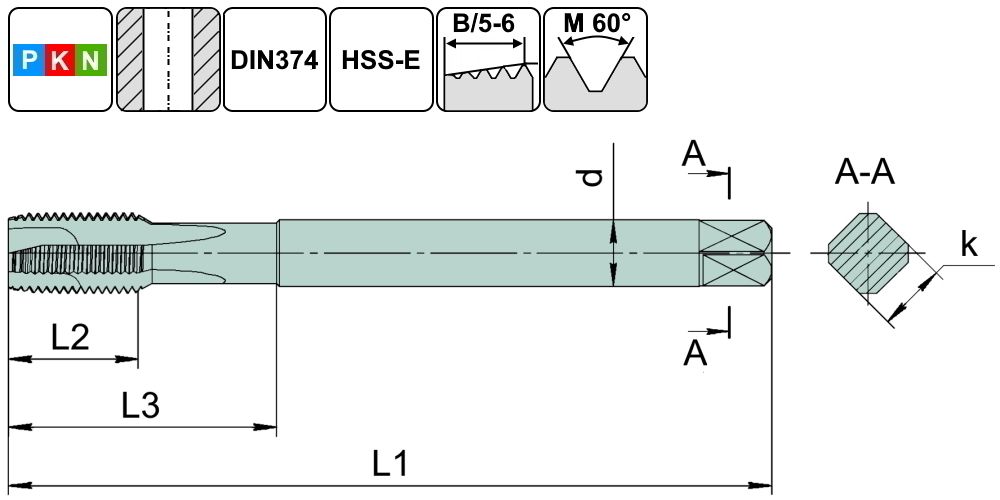 TSP1.M14х1,25.6H.DIN374.TiN.M35 Метчик М14х1,25 для сквозных отверстий, DIN374, с покрытием TiN