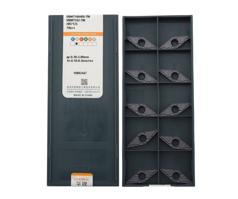 Твердосплавная сменная пластина VBMT160408-TM-HR7125 бренда Huareal применяется для получистовой обработки заготовок из нержавеющей стали.
