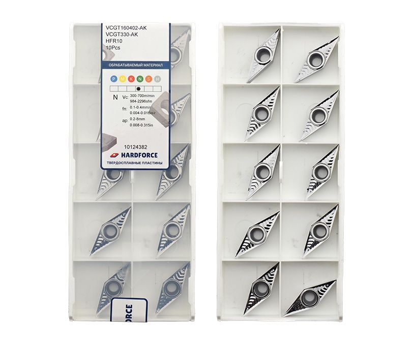 Твердосплавная сменная пластина VCGT160402-AK-HFR10 применяется для получистовой обработки заготовок из алюминия и сплавов цветных металлов.