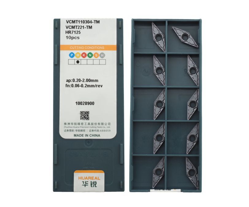 Твердосплавная сменная пластина VCMT110304-TM-HR7125 бренда Huareal применяется для получистовой обработки заготовок из нержавеющей стали.
