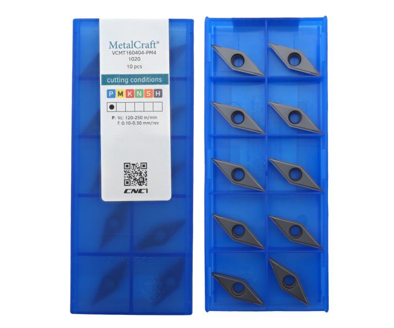 Твердосплавная сменная пластина VCMT160404-PM4-1020 бренда MetalCraft применяется для получистовой обработки заготовок из стали.