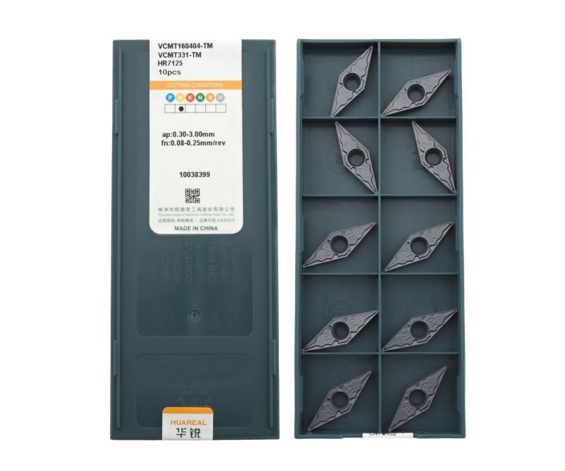 Твердосплавная сменная пластина VCMT160404-TM-HR7125 бренда Huareal применяется для получистовой обработки заготовок из нержавеющей стали.