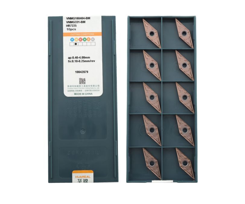 Твердосплавная сменная пластина VNMG160404-BM-HR7225 бренда Huareal применяется для получистовой обработки заготовок из нержавеющей стали.