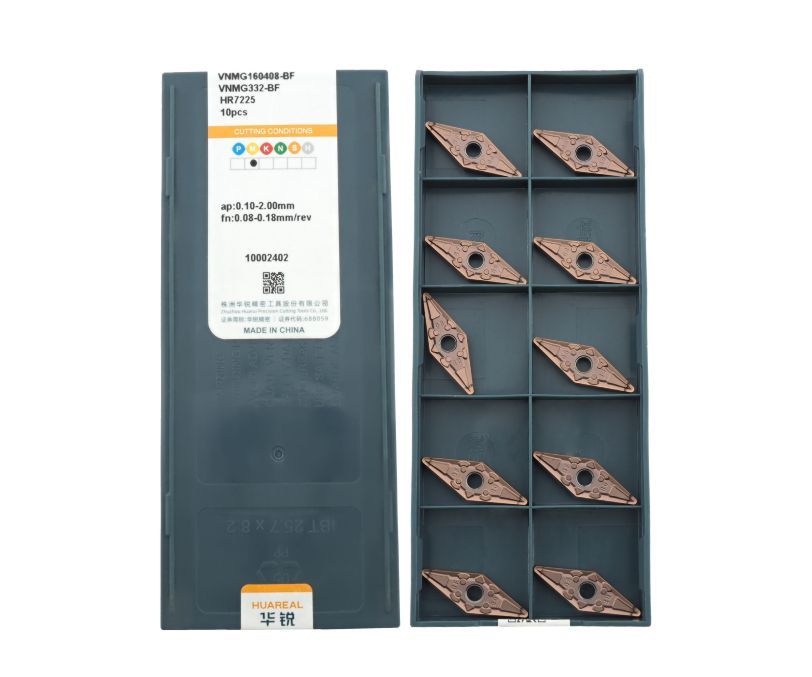 Твердосплавная сменная пластина VNMG160408-BF-HR7225 бренда Huareal применяется для чистовой обработки заготовок из нержавеющей стали.