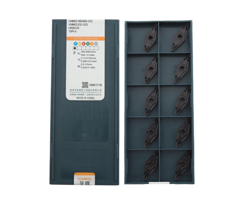 Твердосплавная сменная пластина VNMG160408-GQ-HR8225 бренда Huareal применяется для получистовой обработки заготовок из стали.