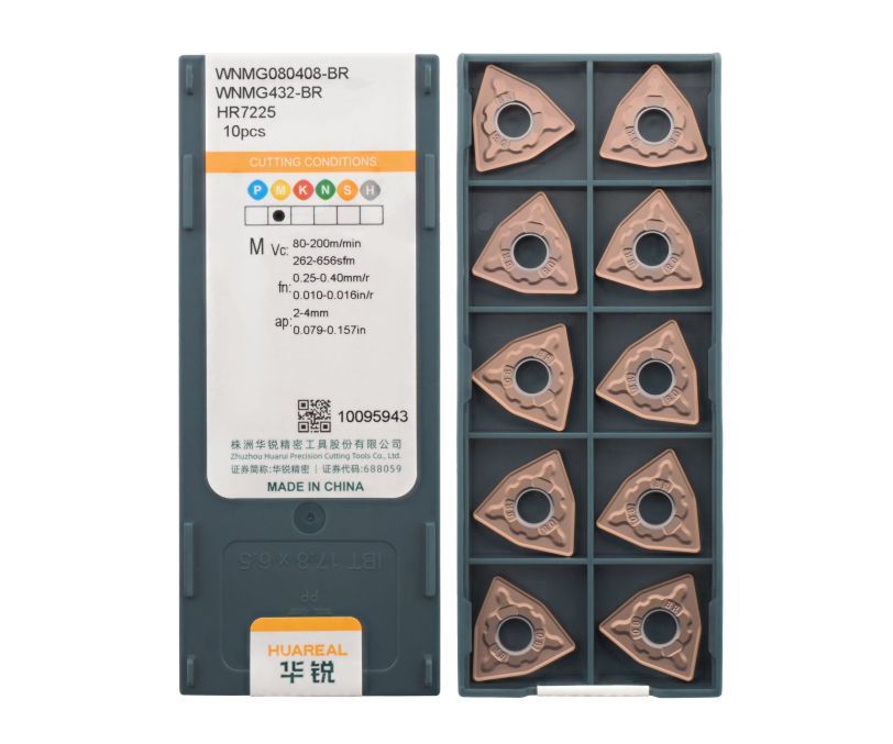Твердосплавная сменная пластина WNMG080408-BR-HR7225 бренда Huareal применяется для черновой обработки заготовок из нержавеющей стали.