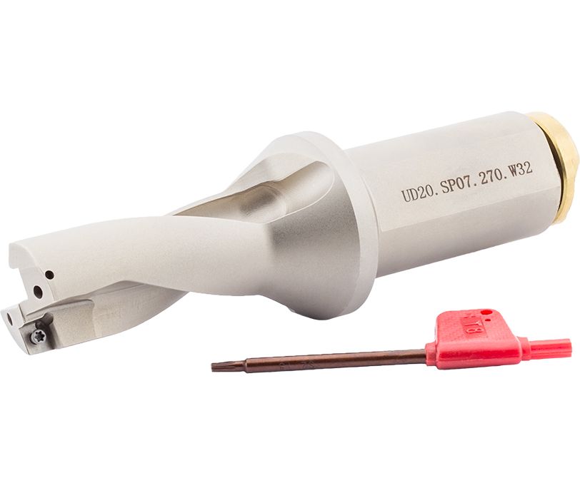 Сверло со сменными пластинами, отношение длины к диаметру D/L=2, типа UD20 с внутренним подводом СОЖ. Рабочий диаметр D=27 мм, диаметр хвостовика Weldon d=32 мм. Максимальная глубина сверления Lc=54 мм. Применяемые пластины: SP..07T308.