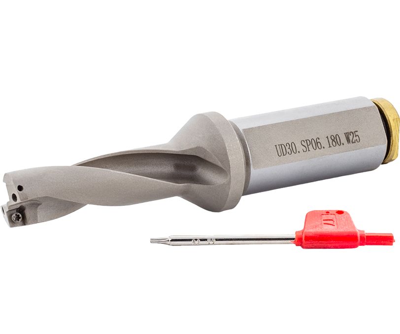 Сверло со сменными пластинами, отношение длины к диаметру D/L=3, типа UD30 с внутренним подводом СОЖ. Рабочий диаметр D=18 мм, диаметр хвостовика Weldon d=25 мм. Максимальная глубина сверления Lc=54 мм. Применяемые пластины: SP..060204.