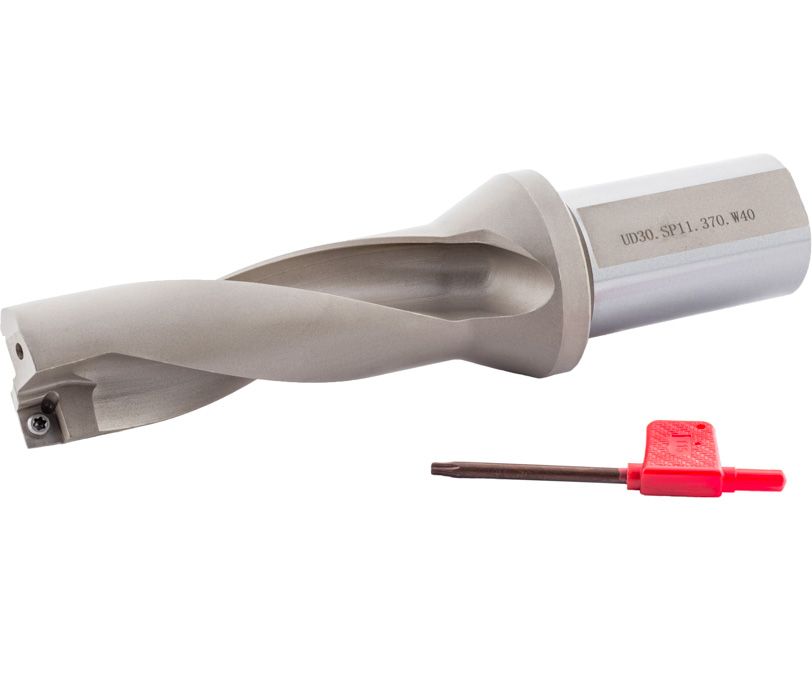 Сверло со сменными пластинами, отношение длины к диаметру D/L=3, типа UD30 с внутренним подводом СОЖ. Рабочий диаметр D=37 мм, диаметр хвостовика Weldon d=40 мм. Максимальная глубина сверления Lc=111 мм. Применяемые пластины: SP..110408.