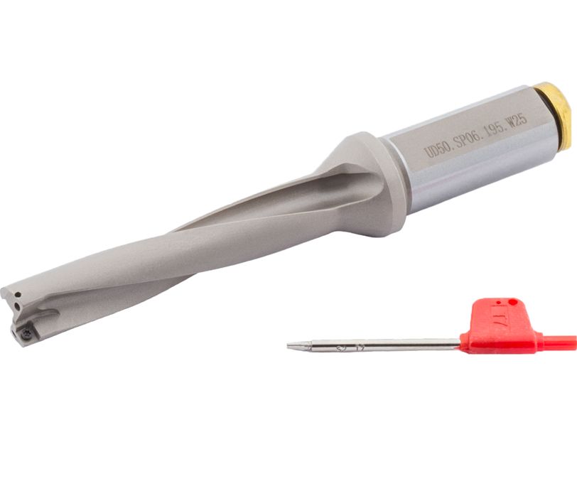 Сверло со сменными пластинами, отношение длины к диаметру D/L=5, типа UD50 с внутренним подводом СОЖ. Рабочий диаметр D=19,5 мм, диаметр хвостовика Weldon d=25 мм. Максимальная глубина сверления Lc=100 мм. Применяемые пластины: SP..060204.