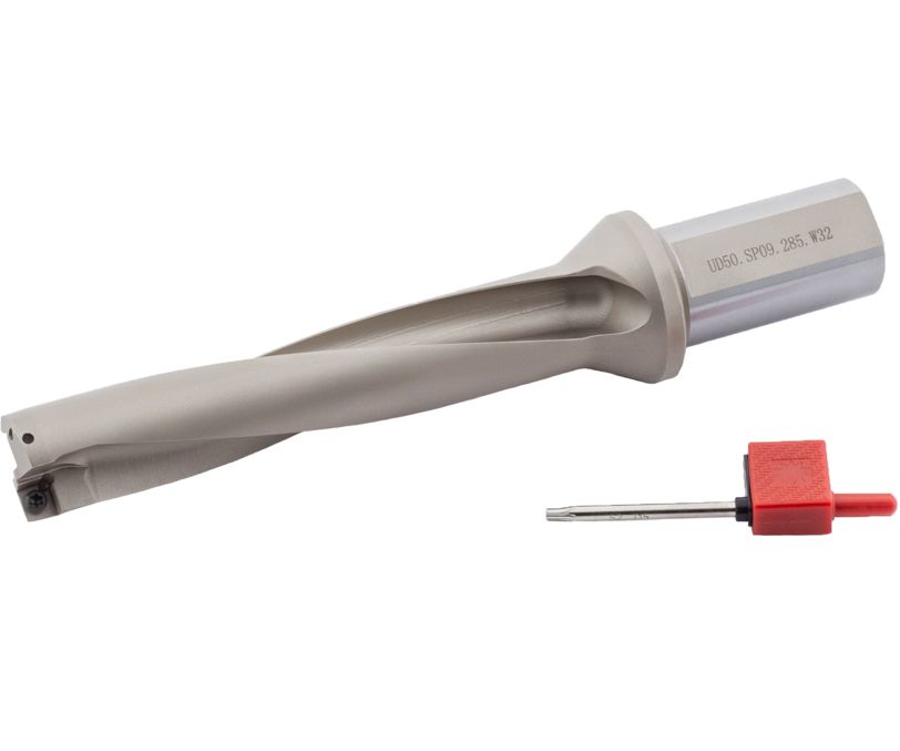 Сверло со сменными пластинами, отношение длины к диаметру D/L=5, типа UD50 с внутренним подводом СОЖ. Рабочий диаметр D=28,5 мм, диаметр хвостовика Weldon d=32 мм. Максимальная глубина сверления Lc=145 мм. Применяемые пластины: SP..090408.