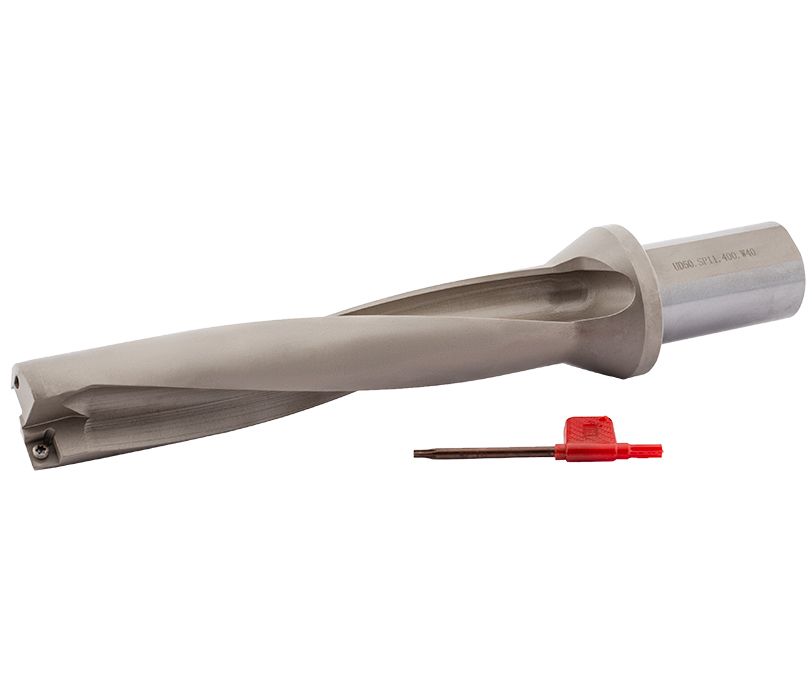 Сверло со сменными пластинами, отношение длины к диаметру D/L=5, типа UD50 с внутренним подводом СОЖ. Рабочий диаметр D=41 мм, диаметр хвостовика Weldon d=40 мм. Максимальная глубина сверления Lc=314 мм. Применяемые пластины: SP..110408.