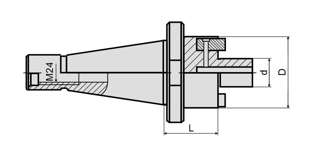 Фрезерный патрон NT50-FMB22-050 (DIN 2080, ISO 7388/1) предназначен для фиксации торцевой насадной фрезы с диаметром посадочного отверстия 22 мм, используется в универсальных фрезерных станках (без ЧПУ). Установка фрезы в оправку производится затяжным винтом. Крепление патрона в шпинделе производится при помощи штревельного болта M24, который не входит в комплект поставки и приобретается дополнительно. Вылет патрона от шпинделя станка составляет 50 мм.