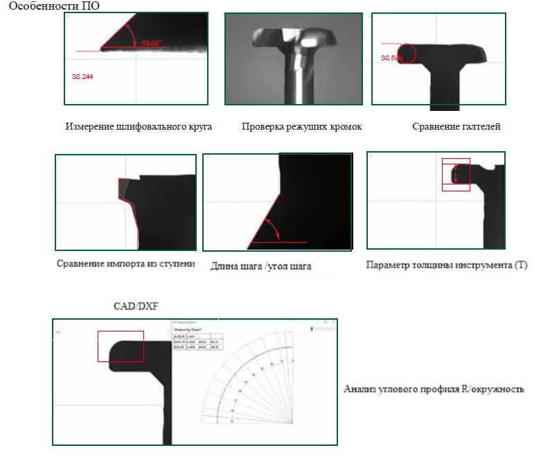- Специализированное ПО: Программное обеспечение разработано для точного измерения контуров фрез, свёрл и нестандартного фасонного инструмента. Включает специальную библиотеку и программы для быстрого и точного измерения шлифовальных кругов различных форм.