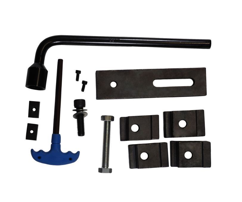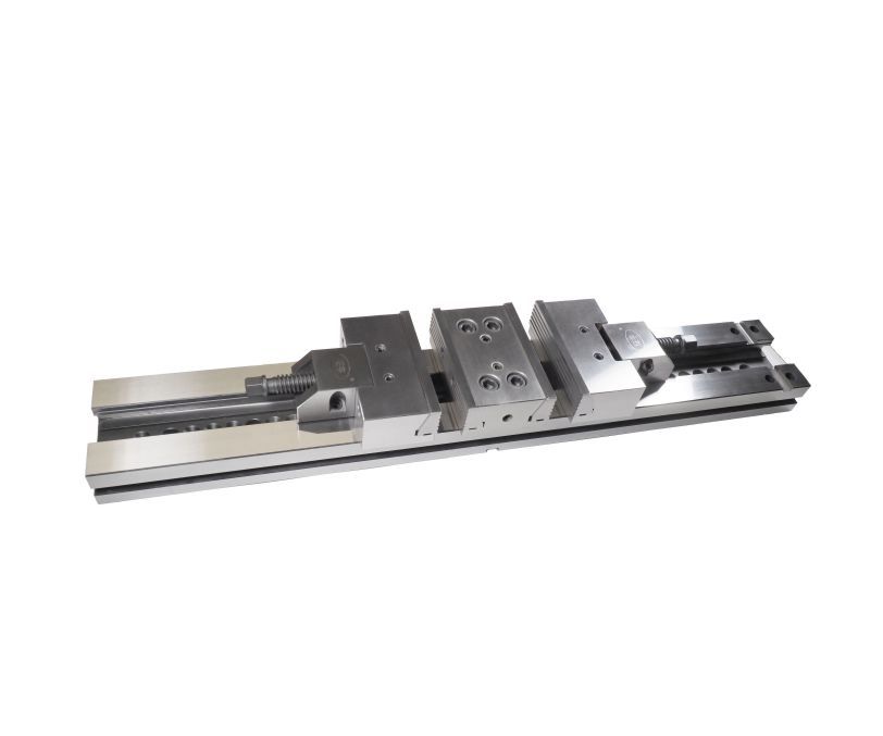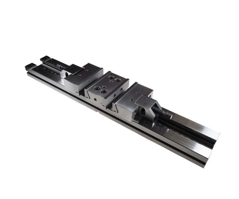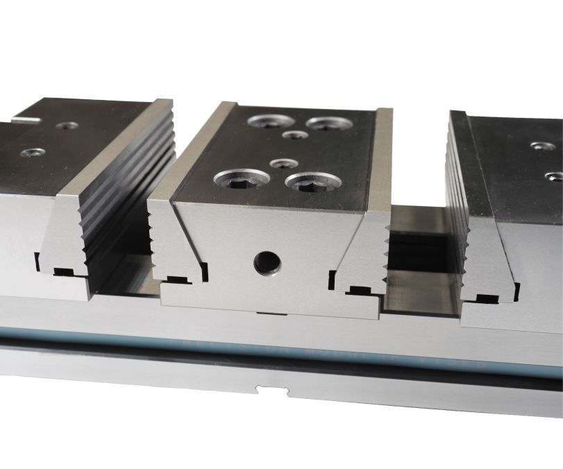 Тиски являются модульными и состоят из основания и трех блоков (два подвижных и один центральный). Блоки легко демонтируются и устанавливаются в нужной конфигурации. Для повышения долговечности и надёжности конструкции используется высококачественная легированная сталь. Направляющие компоненты закалены до твёрдости 58–62 HRC, что существенно улучшает точность зажима и увеличивает ресурс работы оборудования.