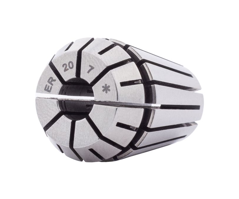 Цанга ER20-7 (DIN 6499B, ISO 15488-B) предназначена для фиксации осевого инструмента с диаметром хвостовика 6,1 ... 7 мм, применяется совместно с патронами типа ER. Сквозное отверстие позволяет размещать инструмент, длина которого превышает высоту цанги. Зажимное усилие на хвостовик инструмента осуществляется в двух зонах, что обеспечивает надежное крепление инструмента и существенное снижает радиальное биение в процессе эксплуатации.