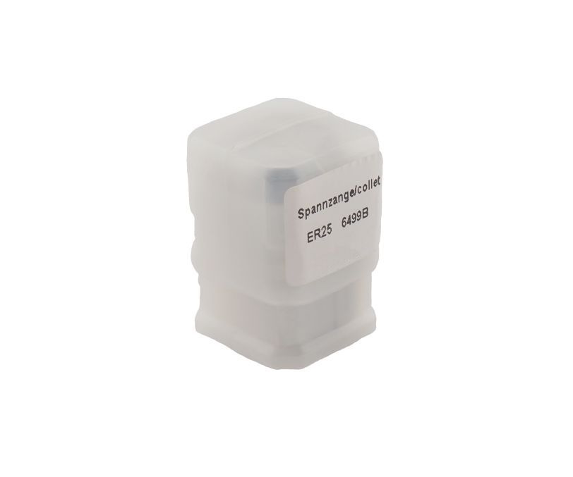 Цанга ER25-16 (DIN 6499B, ISO 15488-B) предназначена для фиксации осевого инструмента с диаметром хвостовика 15,1 ... 16 мм, применяется совместно с патронами типа ER. Сквозное отверстие позволяет размещать инструмент, длина которого превышает высоту цанги. Зажимное усилие на хвостовик инструмента осуществляется в двух зонах, что обеспечивает надежное крепление инструмента и существенное снижает радиальное биение в процессе эксплуатации.