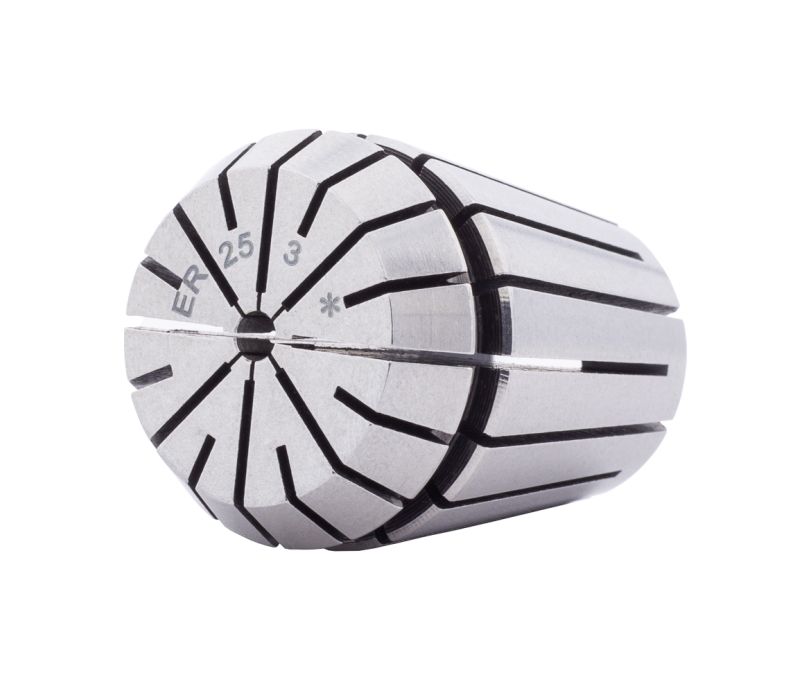Цанга ER25-3 (DIN 6499B, ISO 15488-B) предназначена для фиксации осевого инструмента с диаметром хвостовика 2,1 ... 3 мм, применяется совместно с патронами типа ER. Сквозное отверстие позволяет размещать инструмент, длина которого превышает высоту цанги. Зажимное усилие на хвостовик инструмента осуществляется в двух зонах, что обеспечивает надежное крепление инструмента и существенное снижает радиальное биение в процессе эксплуатации.