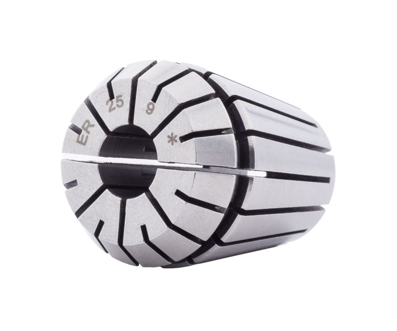 Цанга ER25-9 (DIN 6499B, ISO 15488-B) предназначена для фиксации осевого инструмента с диаметром хвостовика 8,1 ... 9 мм, применяется совместно с патронами типа ER. Сквозное отверстие позволяет размещать инструмент, длина которого превышает высоту цанги. Зажимное усилие на хвостовик инструмента осуществляется в двух зонах, что обеспечивает надежное крепление инструмента и существенное снижает радиальное биение в процессе эксплуатации.