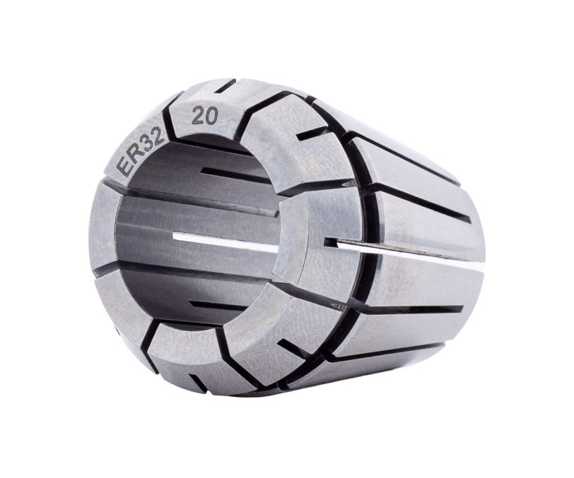 Цанга ER32-20 (DIN 6499B, ISO 15488-B) предназначена для фиксации осевого инструмента с диаметром хвостовика 19,1 ... 20 мм, применяется совместно с патронами типа ER. Сквозное отверстие позволяет размещать инструмент, длина которого превышает высоту цанги. Зажимное усилие на хвостовик инструмента осуществляется в двух зонах, что обеспечивает надежное крепление инструмента и существенное снижает радиальное биение в процессе эксплуатации.