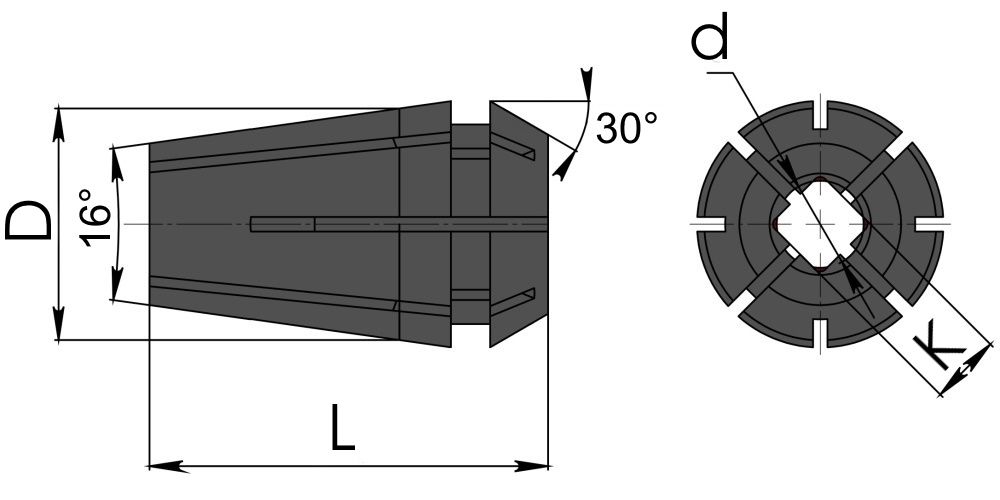Резьбонарезная цанга ER32G-4x3 предназначена для фиксации машинно-ручных метчиков с диаметром хвостовика 4 мм и размером квадрата 3 мм (стандарт ISO), используется для нарезания резьбы М4 в отверстиях.